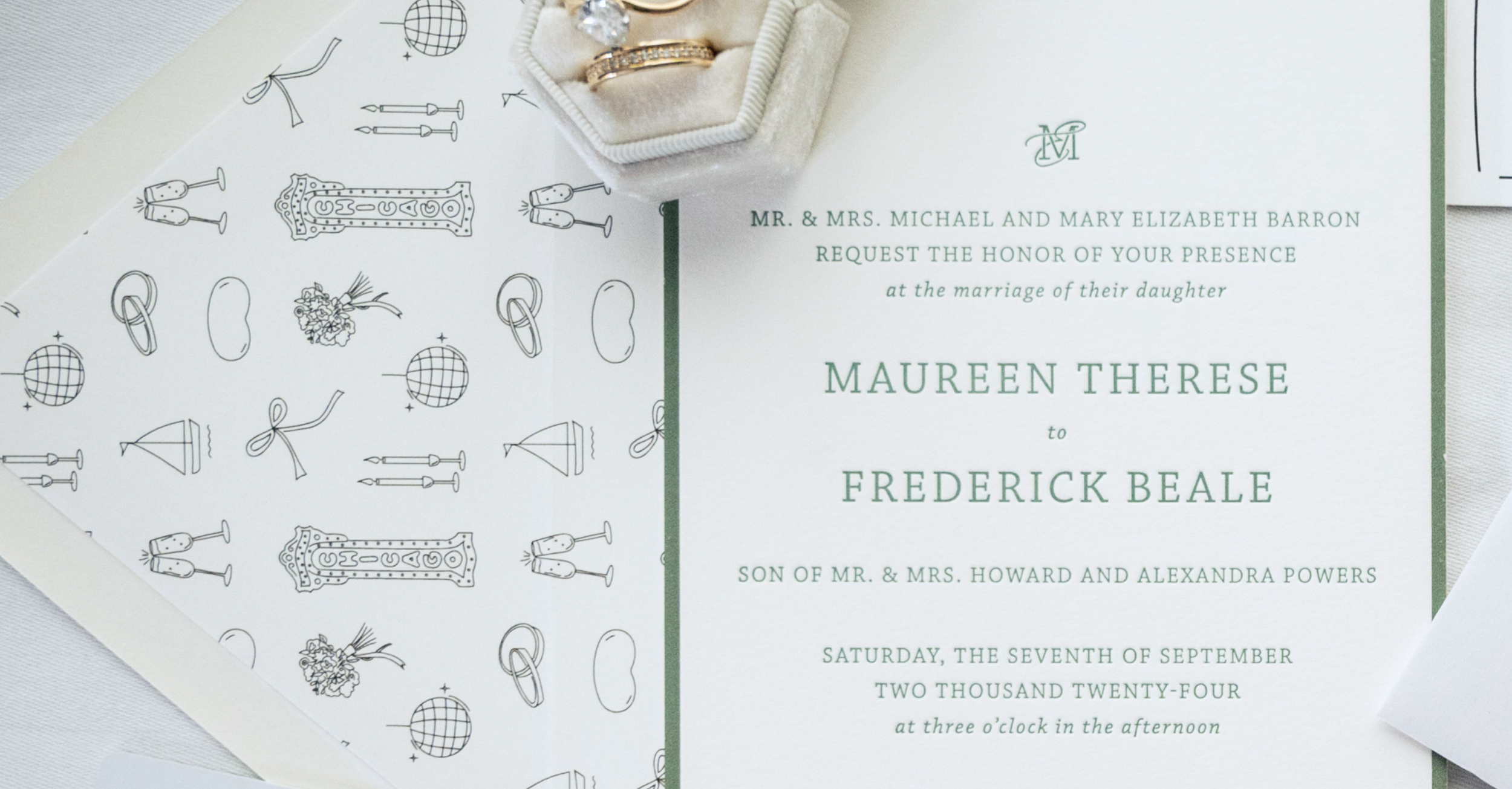 I created custom illustrations for the envelope liner, rehearsal dinner insert, a